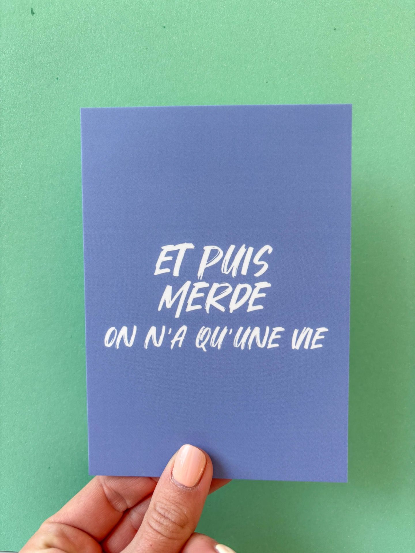 Cette carte, c'est un rappel brutal et libérateur — imprimé en typo soignée sur fond uni, sans fioritures. Pas d'aquarelle ici, juste les mots de Marie Pottiez (Wild Pages) qui disent tout haut ce qu'on pense tout bas. À envoyer à quelqu'un qui hésite, qui doute, qui a besoin d'un coup de pied affectueux.